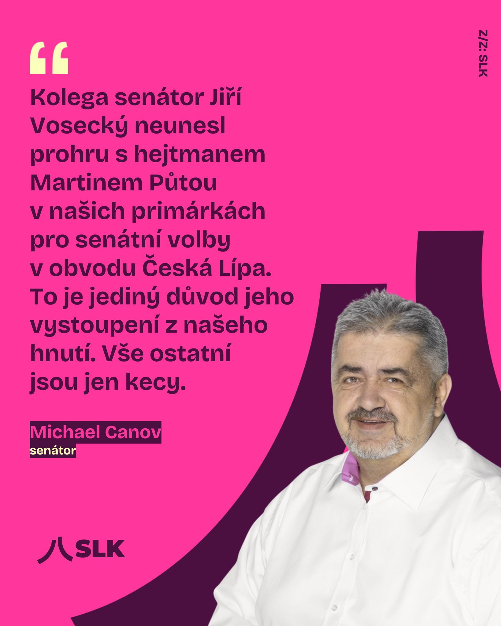 Kolega senátor Jiří Vosecký odešel z hnutí Starostové pro Liberecký kraj. V nadcházejících senátorských volbách v obvodě ČL se ucházel o znovukandidaturu. V primárkách 18. listopadu 2025 ale prohrál se stávajícím hejtmanem a předsedou SLK Martinem Půtou v tajných volbách 42:9. Oba kandidáti na můj explicitní dotaz před volbou, jak se zachovají v případě prohry, zda podpoří vítězného protikandidáta či budou chtít kandidovat za někoho jiného či za sebe, odpověděli, že podpoří vítěze. Jiří se zachoval jinak… Prohru neunesl a kandidovat chce. A to je ten důvod vystoupení… Vše ostatní jsou jen kecy, které pravý a jediný důvod mají zakrýt. Škoda, byl to jeden z prvních členů SLK (nikoli zakládajících).