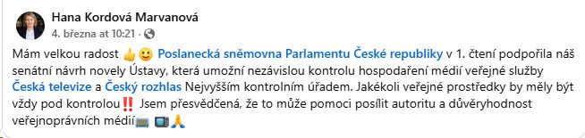 Sdílím velkou radost Hany Kordové Marvanové. Náš senátní návrh na kontrolu médií Nejvyšším kontrolním úřadem ve Sněmovně prošel úspěšně prvním čtením. Úspěch ve Sněmovně s návrhem na kontrolu médií